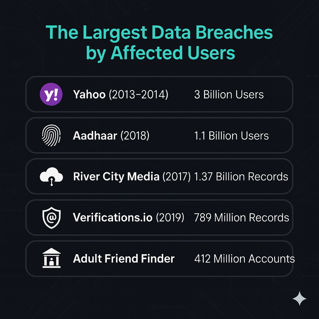 By account count, the Yahoo breach still holds the record, with roughly 3 billion user accounts affected in 2013, plus a separate ~500 million in 2014.
