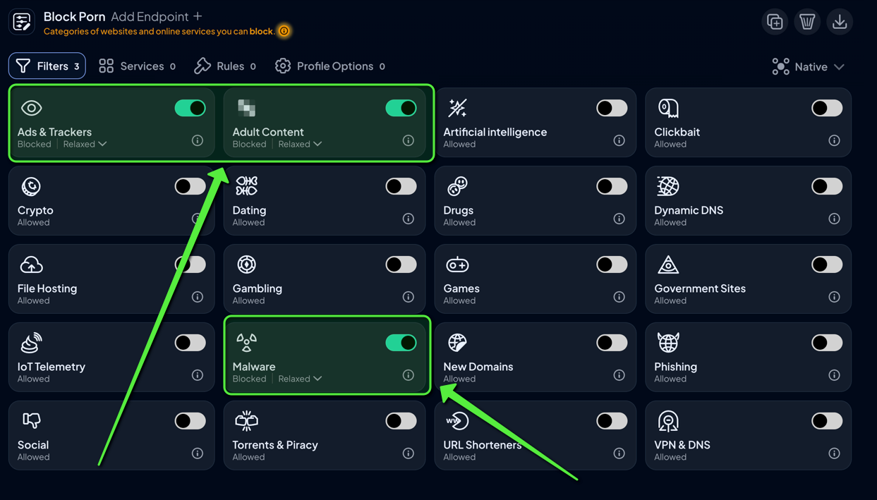 Use category filters for baseline protection, then use Services and Custom Rules for precision exceptions. This supports technology protection without weakening the baseline for protecting children and protecting students. Include an adult content category where your local policy calls for it.