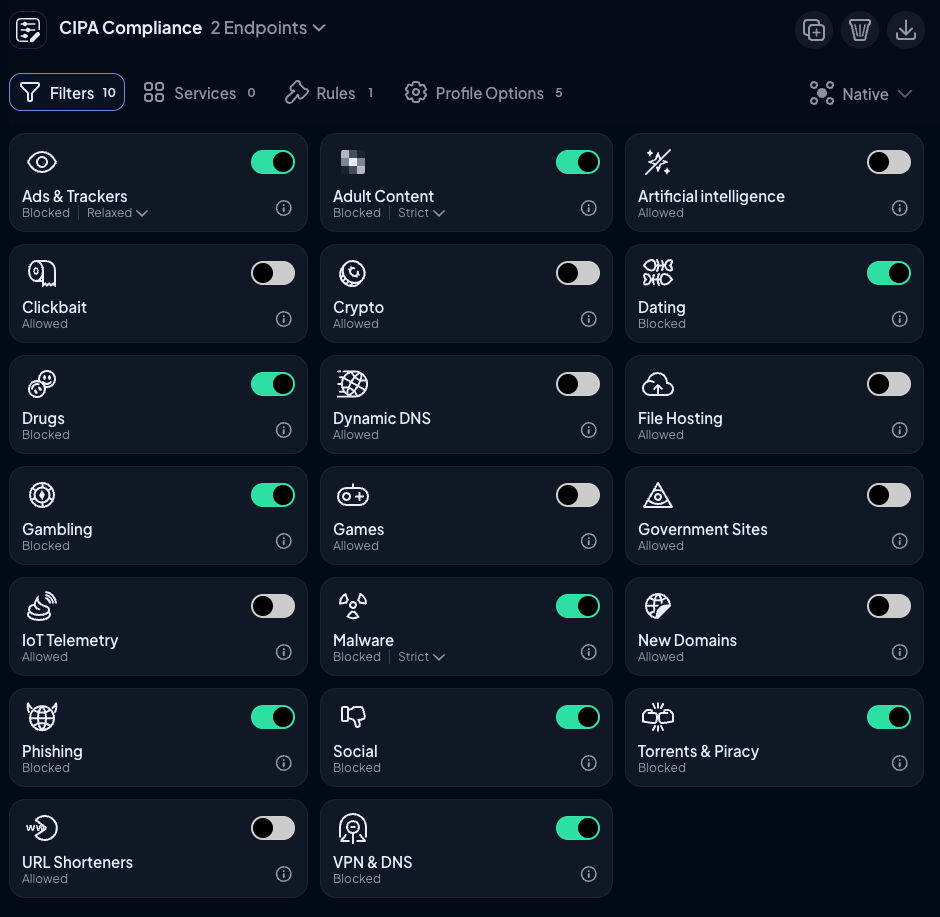 Control D uses Profiles as policy bundles. This lets you keep content filtering aligned to your internet safety policy across the district network and remote devices when you assign Profiles through Control D Endpoints or network settings.