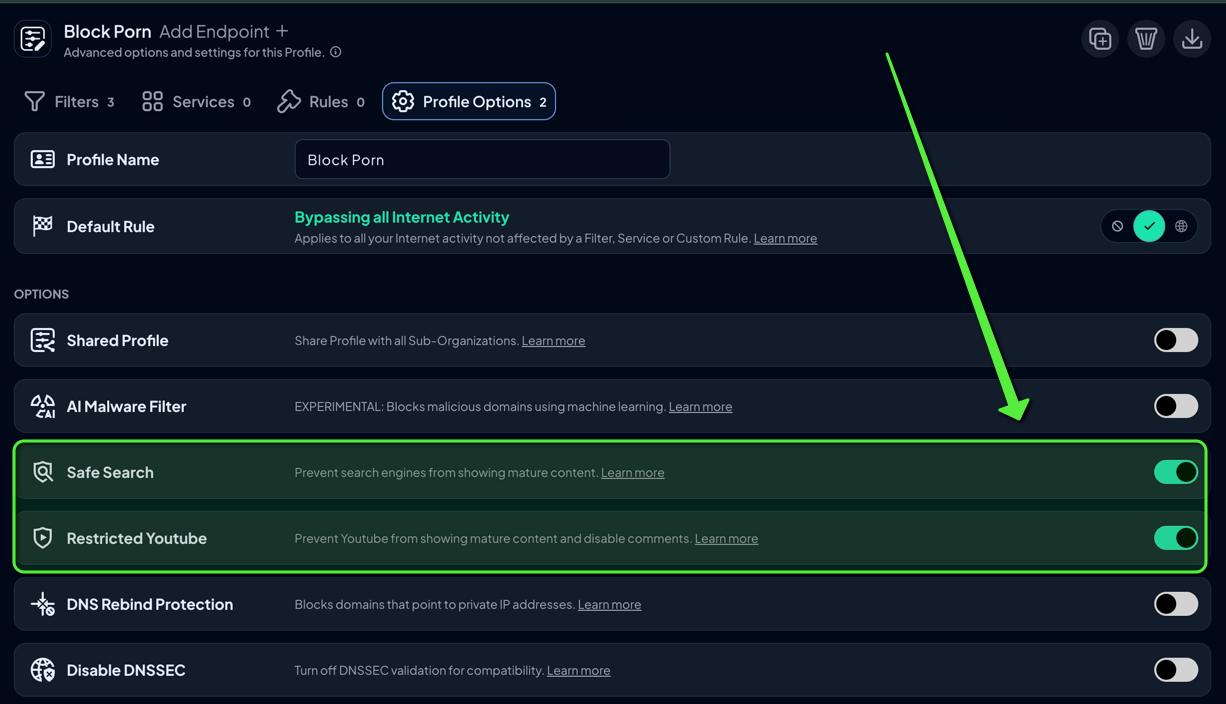 Profiles can combine Filters (categories), Services (site-level controls), Custom Rules (granular domain rules), and Profile Options in one place.