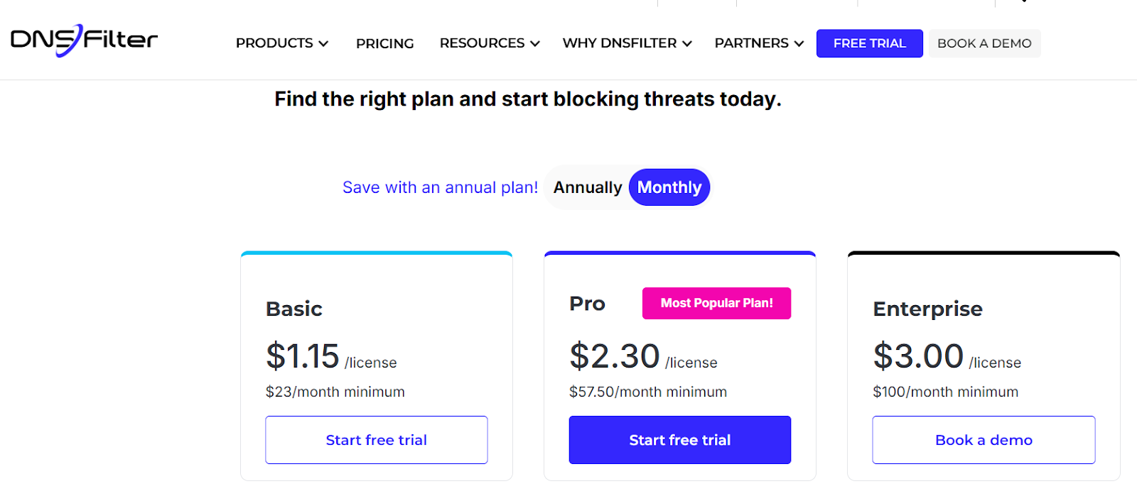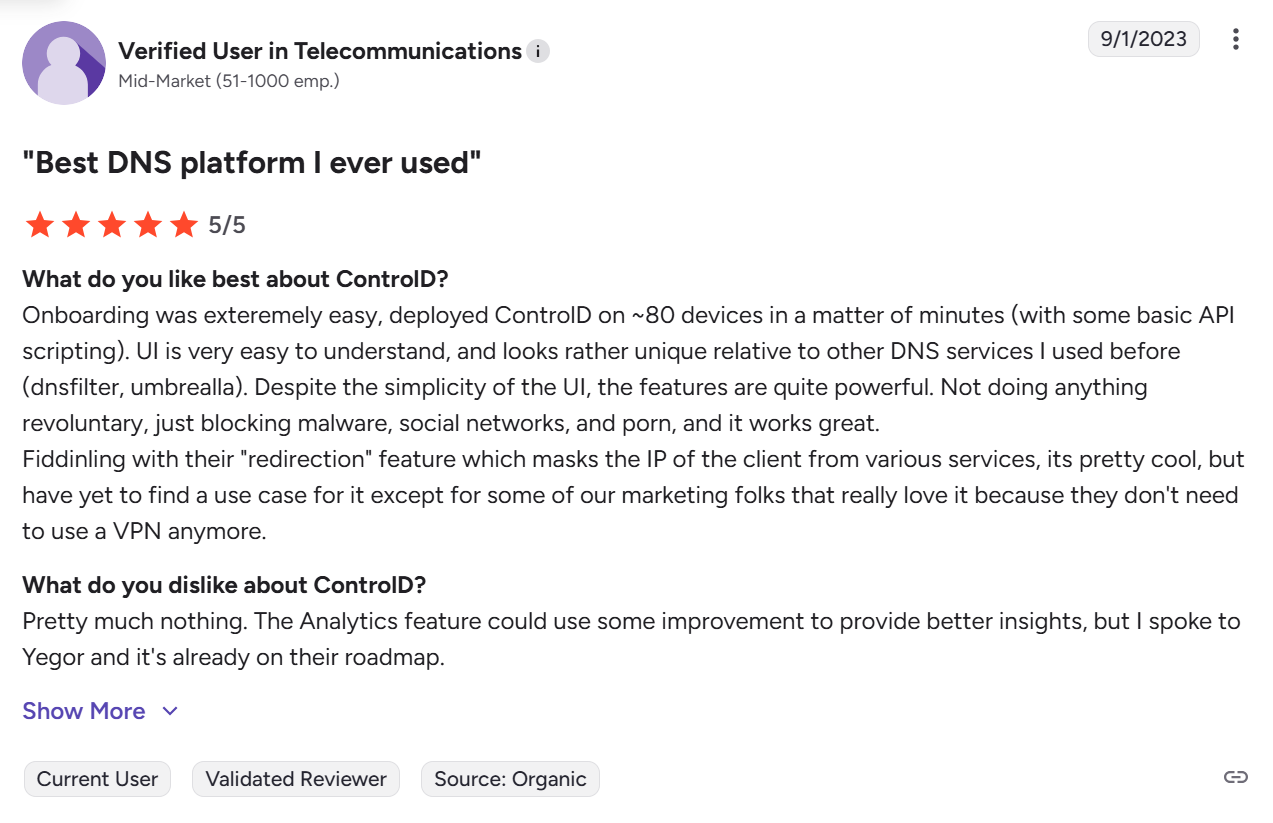 DNSFilter prices per user. Public ranges often land above Control D for similar seat counts. Some features, such as longer log history or certain integrations, are available in higher tiers or as add-ons. That means a switch from Cisco Umbrella to DNSFilter may not lower your bill by much. A move from Umbrella to Control D often gives you a simpler, lower number, especially for mid-sized companies.
