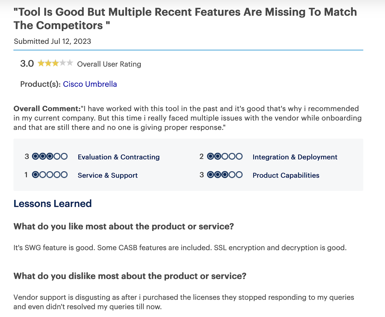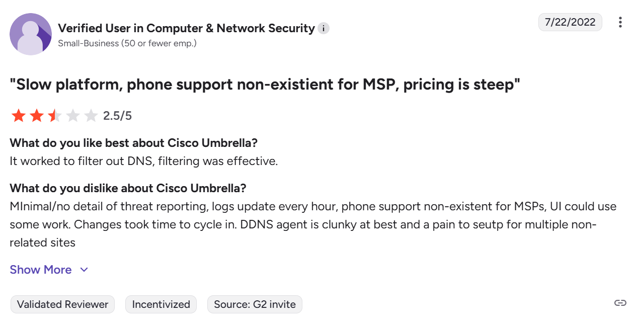 Unfortunately, there are many reviews of Cisco Umbrella where users have been “disgusted” at the lack of support and the inability to contact someone who can help with their issues. Here are just a few examples: