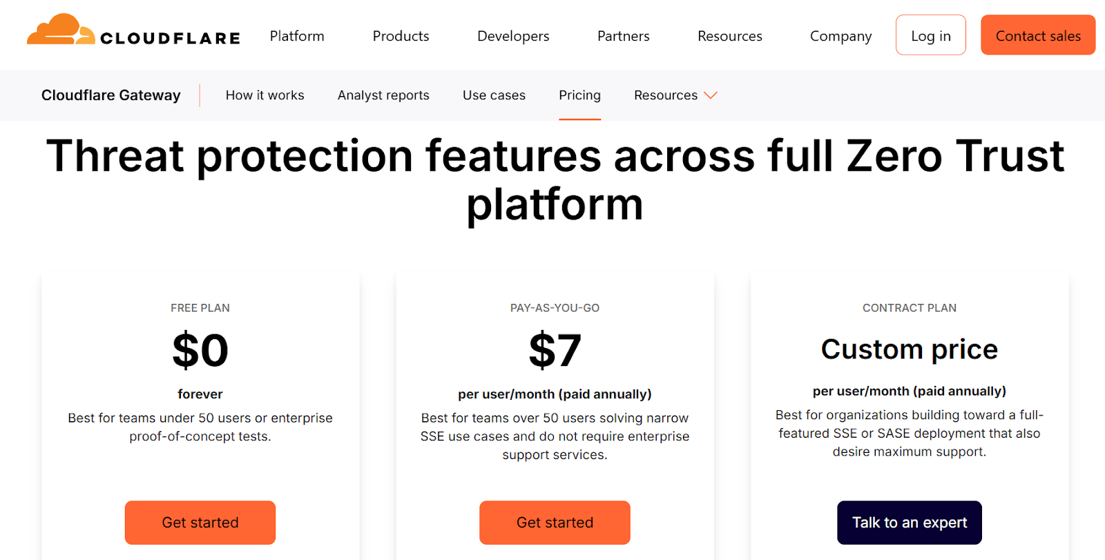 Cloudflare offers a free tier for small tests, a pay-as-you-go tier, and contract plans. The pay-as-you-go plan sits around $7 per user per month once you start real deployment. That price can make sense if you already rely on Cloudflare for DNS, CDN, or security. However, to unlock Cloudflare’s most advanced features, organizations must opt for the Contract plan, which comes at an even steeper cost.