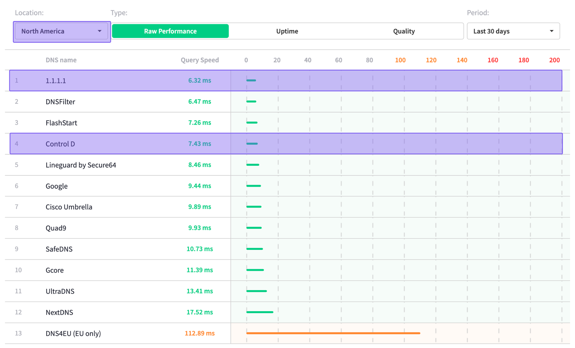 Control D is also among the top performers, with average global speeds of 17.56 ms and average speeds in North America of 7.43 ms.