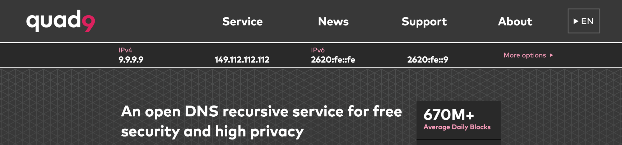 You still get the same benefits as with Quad9, including no logging of DNS queries or data sharing, encrypted DNS support, a global anycast network, and an easy, set-and-forget deployment.