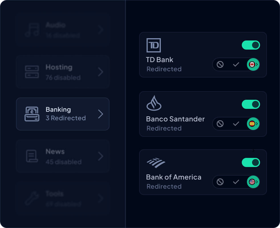 Control D's Traffic Redirection can reroute DNS-based traffic through 100+ proxy locations in 60+ countries to help mask your IP address and make it look like you’re browsing from another region. You can set a single default location for everything, or only redirect certain domains or Services.