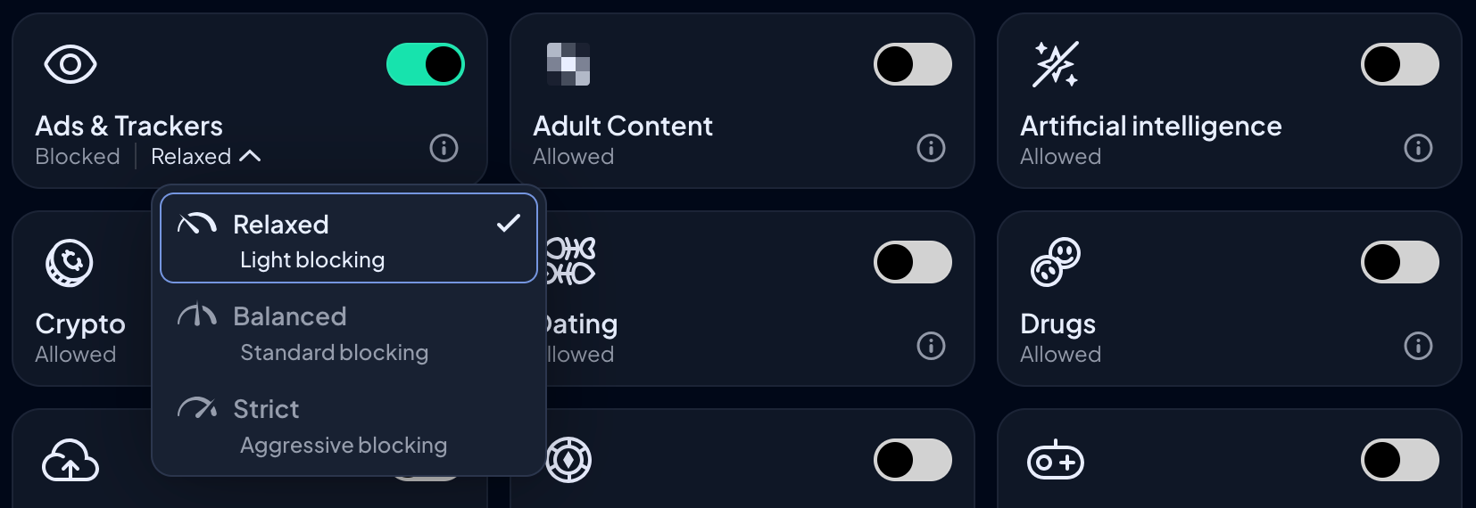 - Relaxed: Blocks the most common, annoying ads and trackers