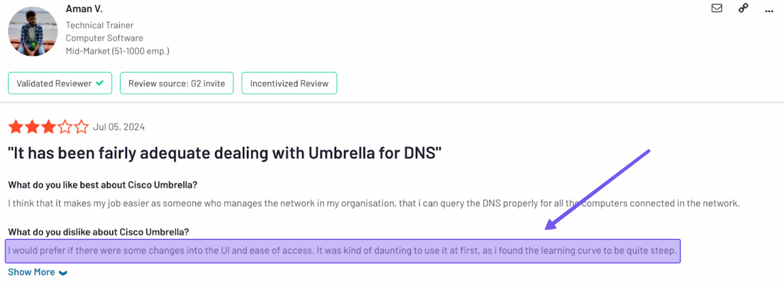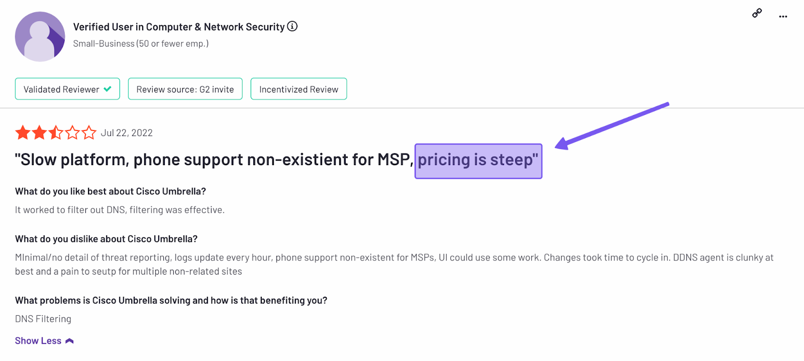 Another thing to note is that Umbrella’s target market is large enterprises with sizable budgets and IT teams. Their product reflects this, with users often mentioning that the service has a steep learning curve.