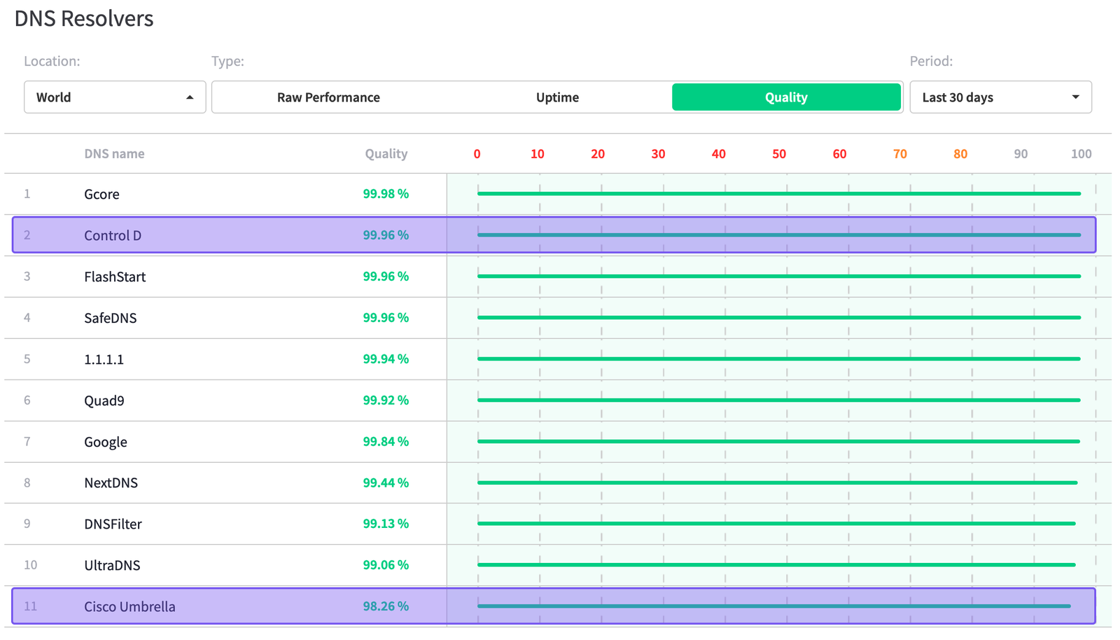 Control D outshines Cisco Umbrella in the Quality metric with a score of 99.96% compared to 98.26%.