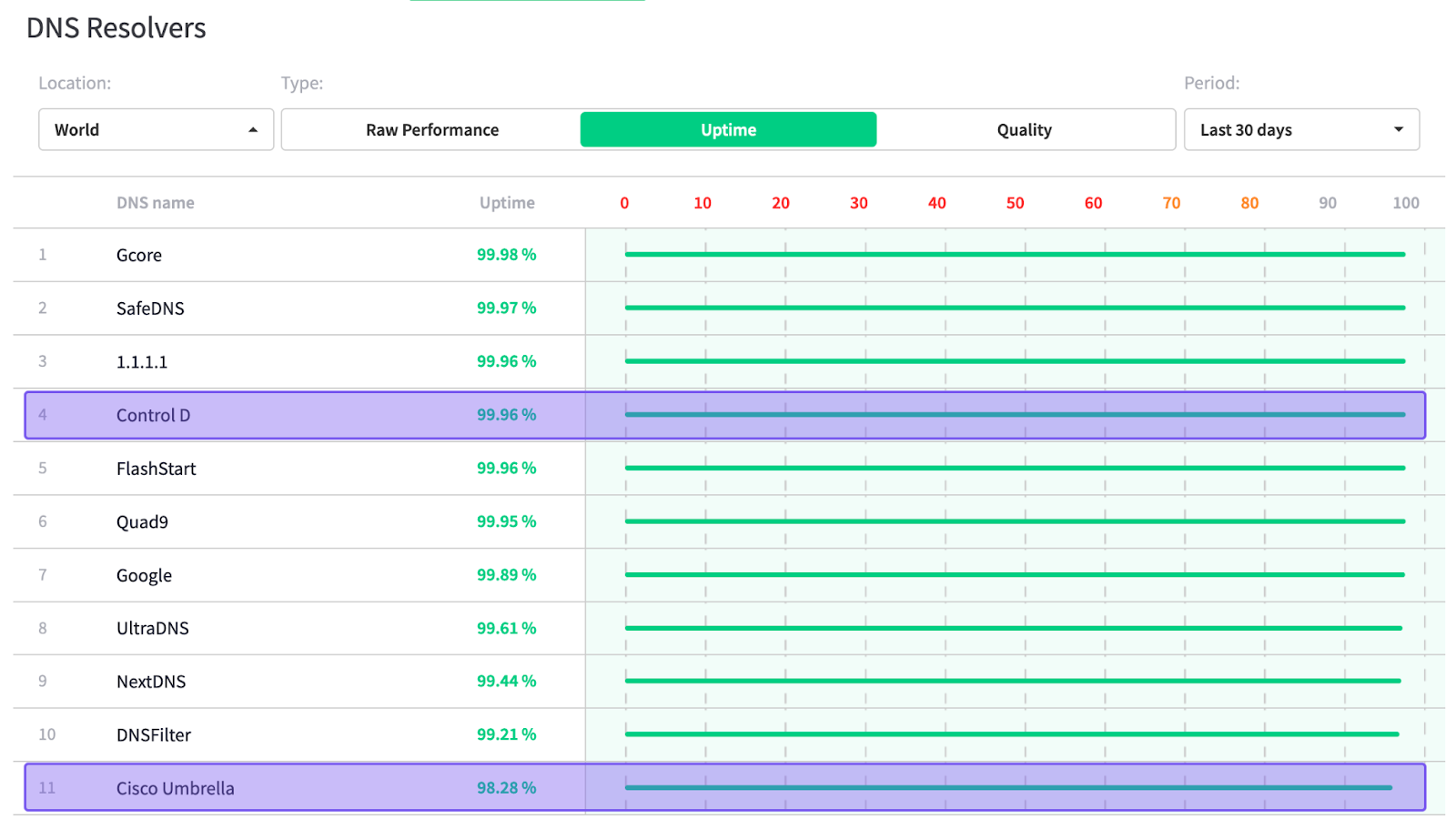 Control D has a superior Uptime of 99.96% compared to Cisco Umbrella’s 98.28%, which comes in last place.
