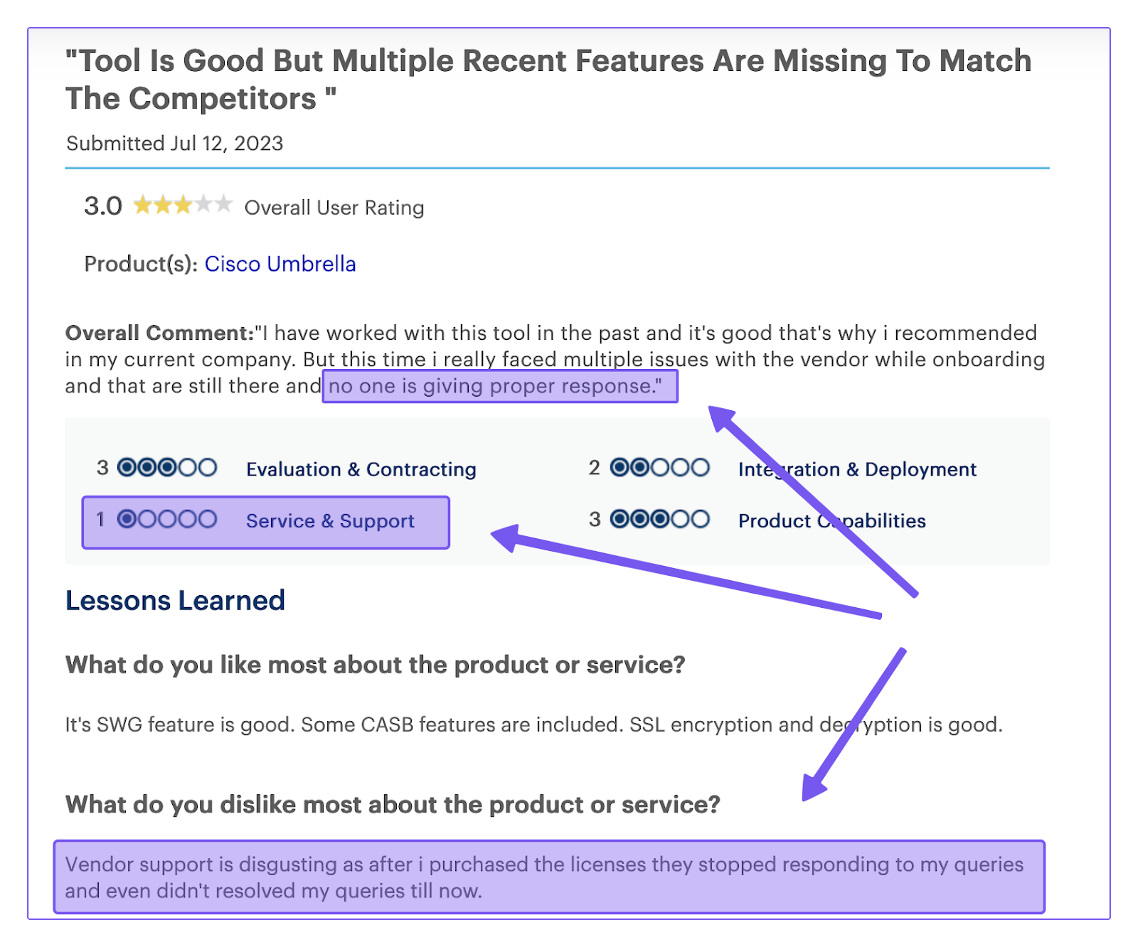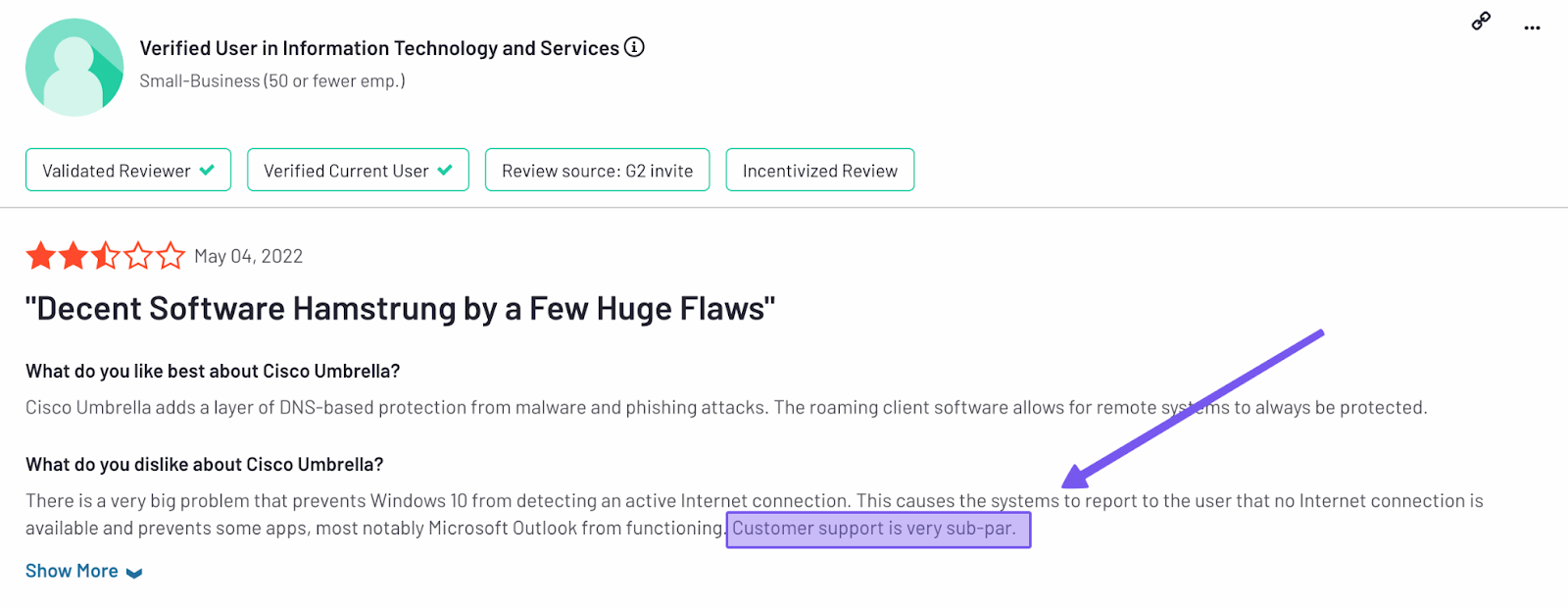 Cisco Umbrella is infamous for having below-par customer support, with many users expressing their displeasure on various online review platforms. The main complaints include the inability to contact a knowledgeable support agent, with one user claiming their support requests were ignored entirely.