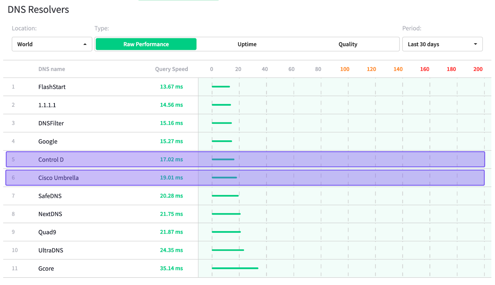 Control D ranks fifth in Performance with a DNS query speed of 17.02 ms, whereas Cisco Umbrella ranks sixth with a speed of 19.01 ms.