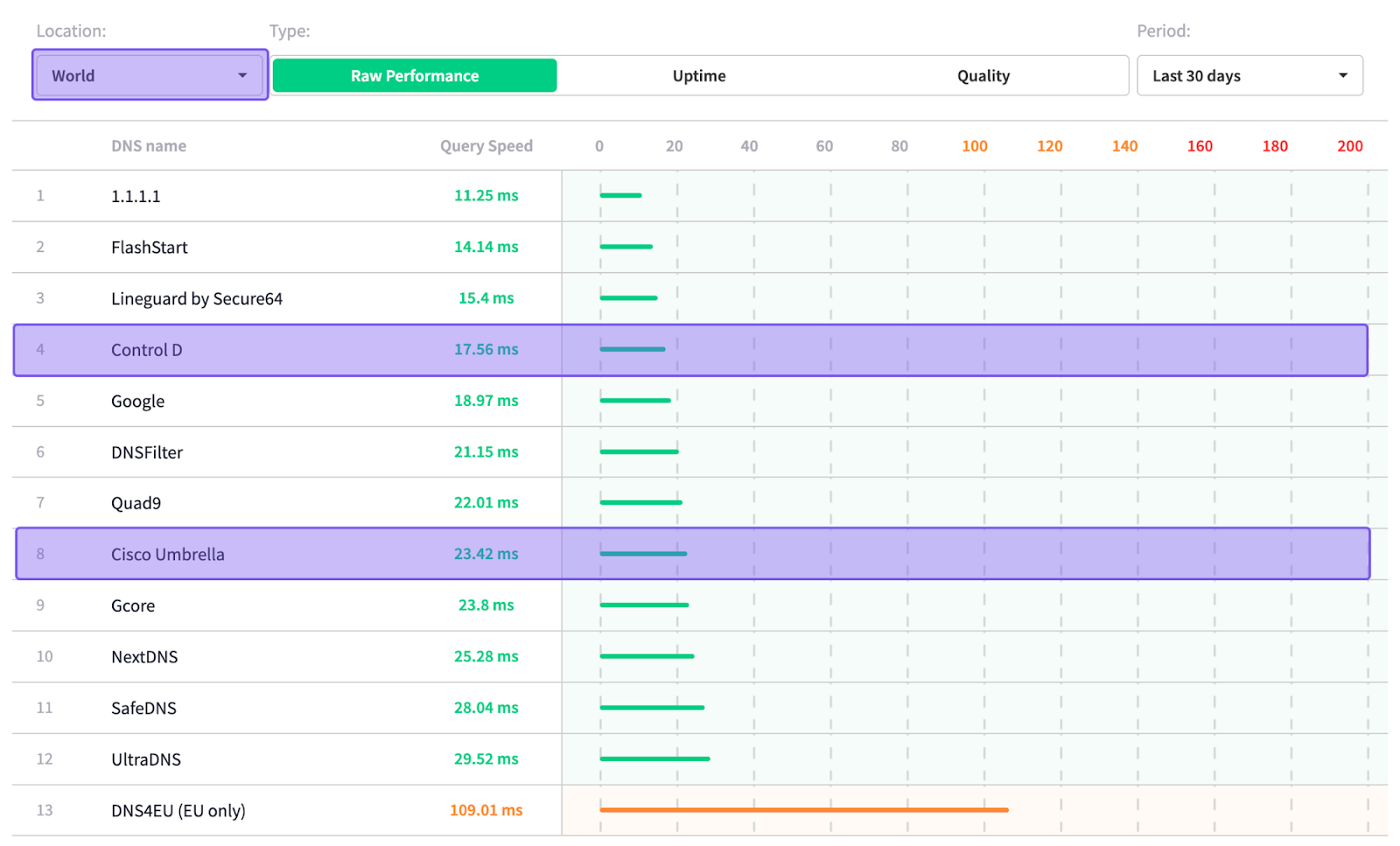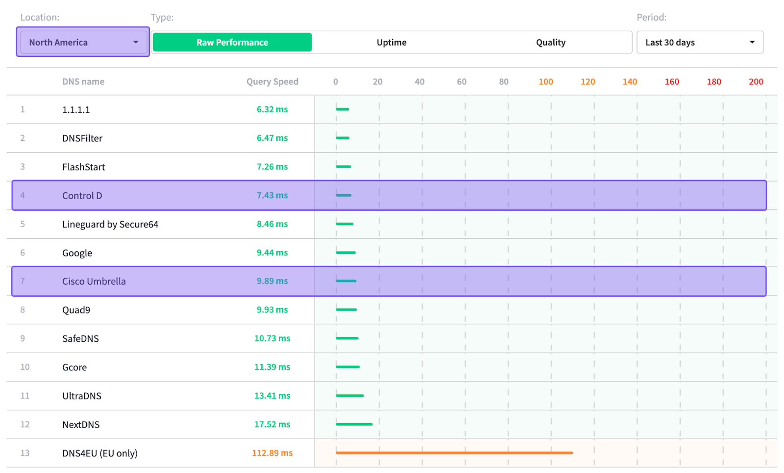 According to independent data from DNSPerf, Control D is ranked among the fastest DNS resolvers for average query time, both globally and in North America: