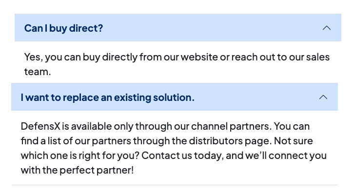 📌 Note: If you weren’t frustrated already, DefensX’s own website seems confused about how you can actually buy the product. One FAQ claims you can 'buy direct,' while another – on the same page – states they are 'available only through channel partners.' In reality, there is no direct checkout; you are forced into sales demos and discussions with third-party distributors.