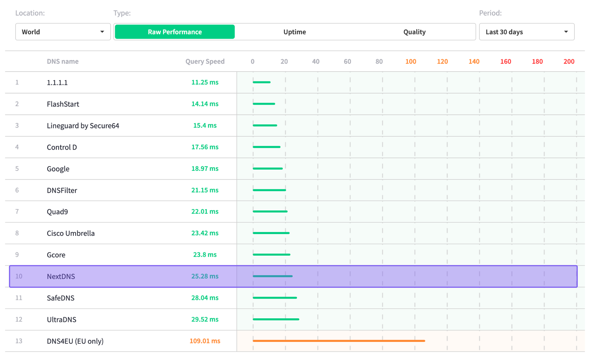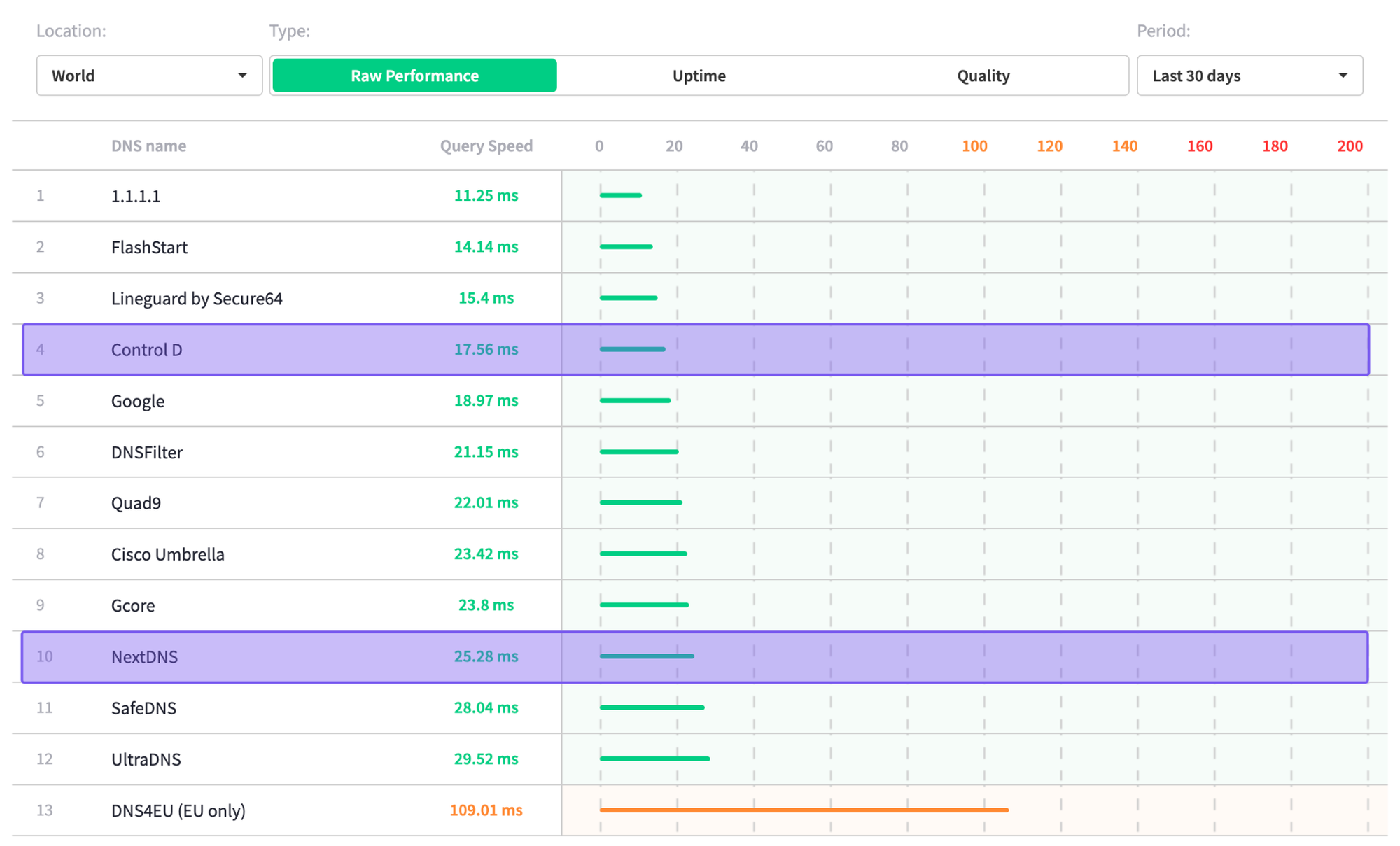 According to DNSPerf's independent data, Control D handily beats NextDNS in global average query speeds with a score of 17.56 ms compared to 25.28 ms.