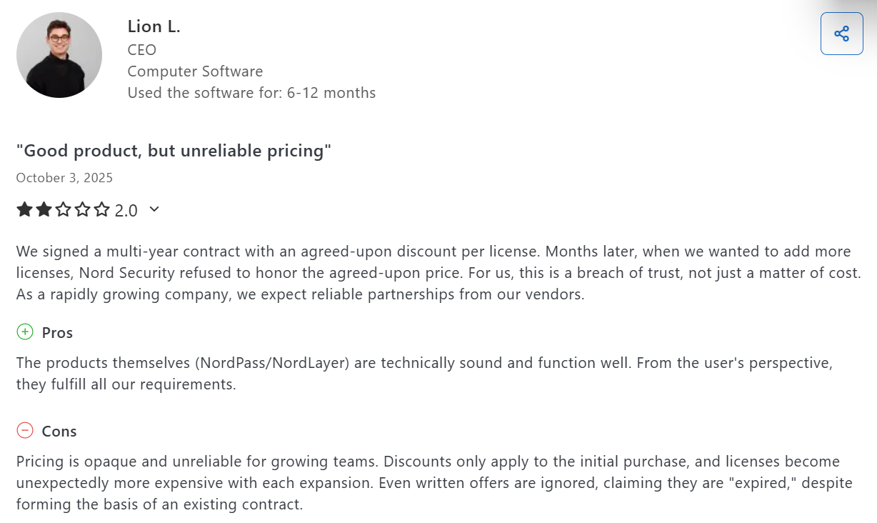 - Users report performance issues with NordLayer, including connection loss and complicated VPN configurations that hinder usability.