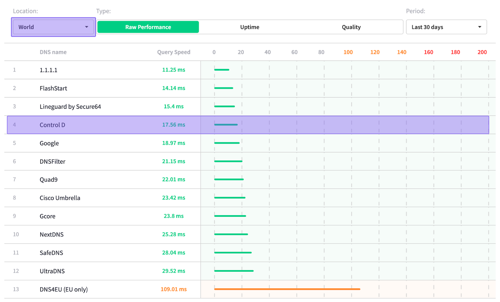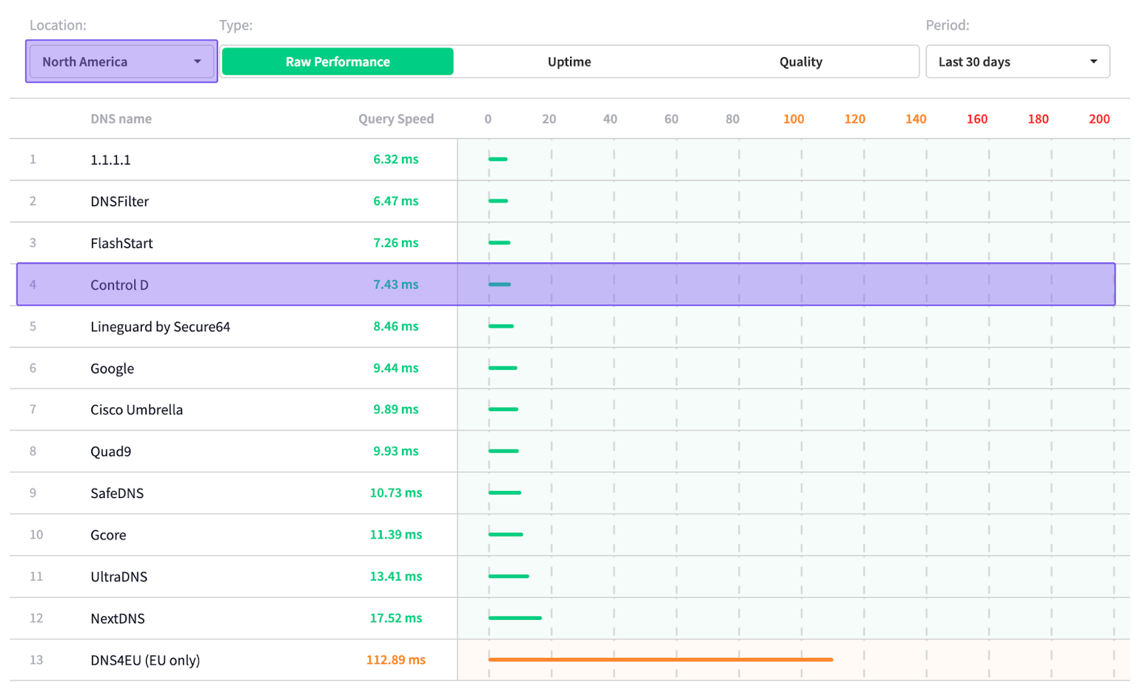 Based on independent data from DNSPerf, Control D ranks among the top for query speed, with some of the quickest average response times both worldwide and across North America: