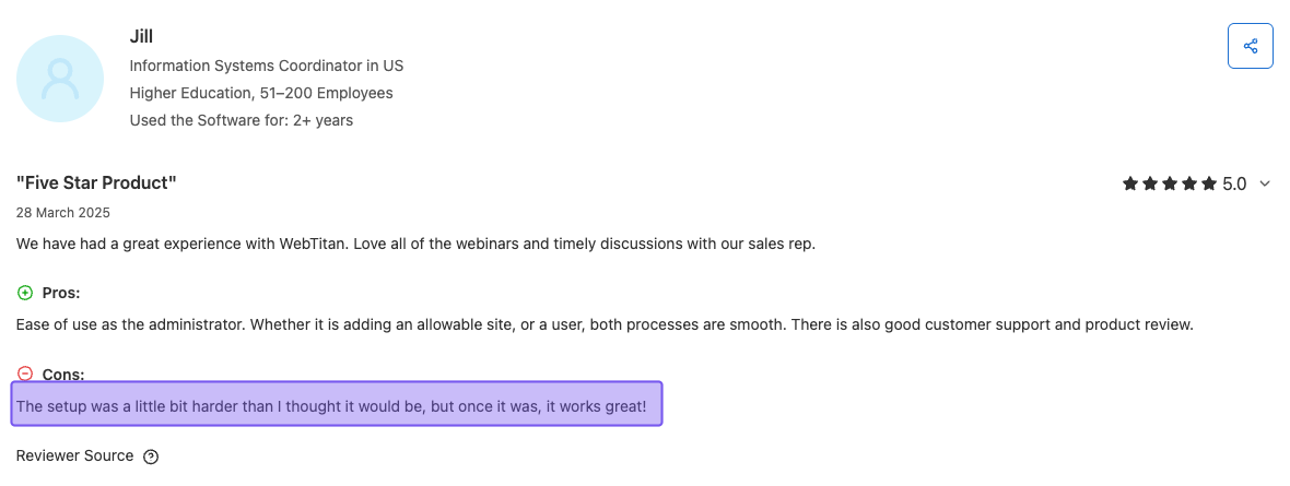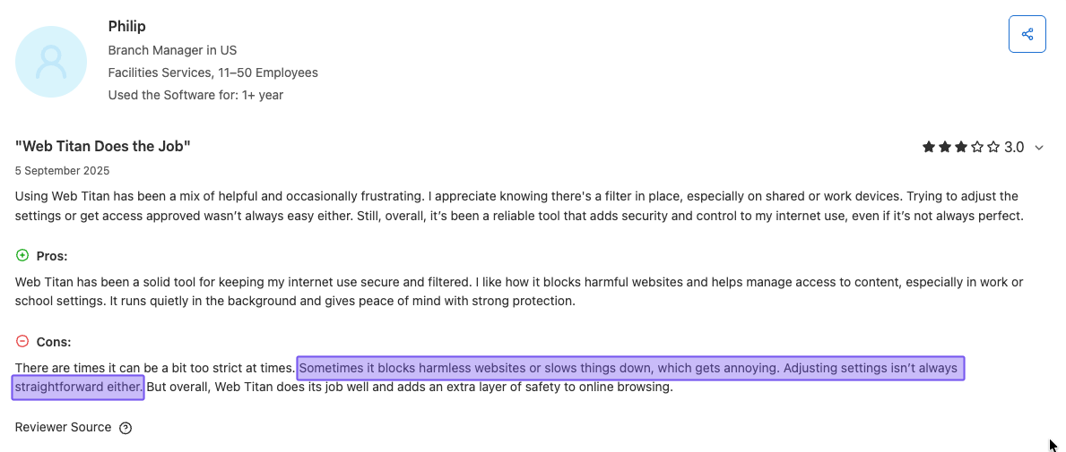That said, once the setup is complete, users generally find that WebTitan works well, with the overall experience improving after the initial hurdle. But the learning curve at the beginning might be frustrating as you get everything configured properly.