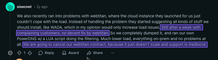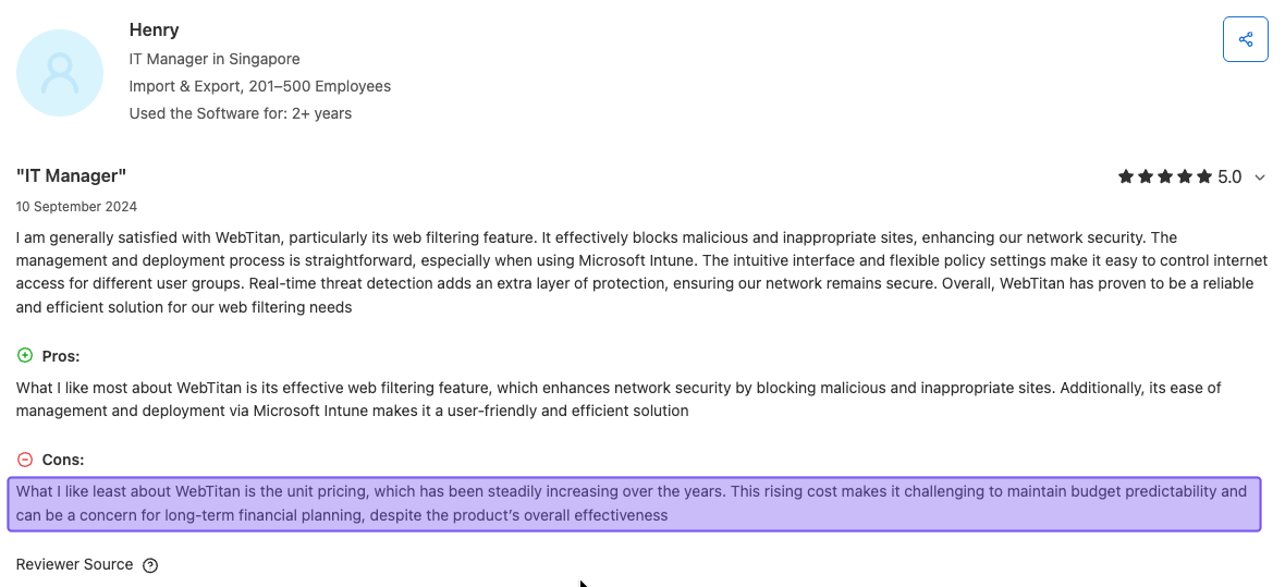 WebTitan does the job, but a few pain points keep popping up: no upfront pricing, complicated deployment, costs that keep rising, and needing to negotiate quotes for what should be simple security software.