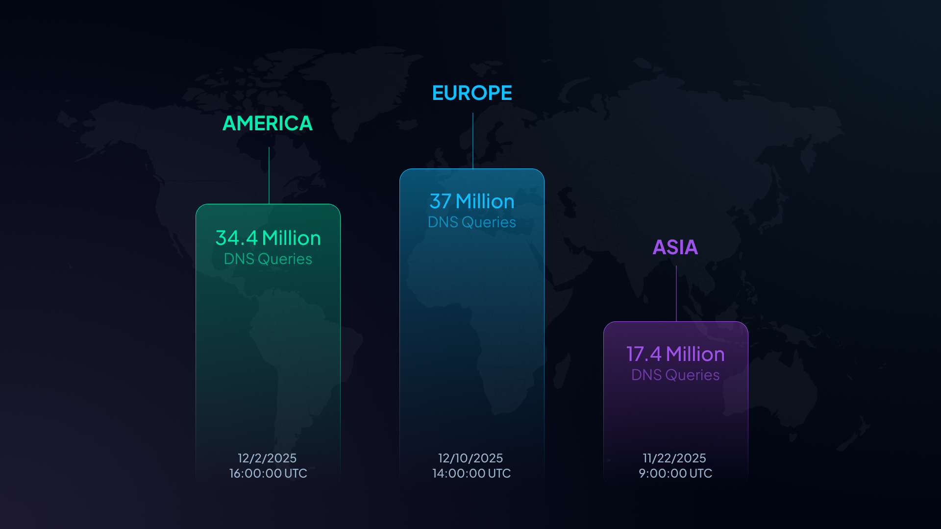 - Europe: December 10, 2025 at 14:00 UTC (15:00 CET): 36.96M DNS queries in one hour