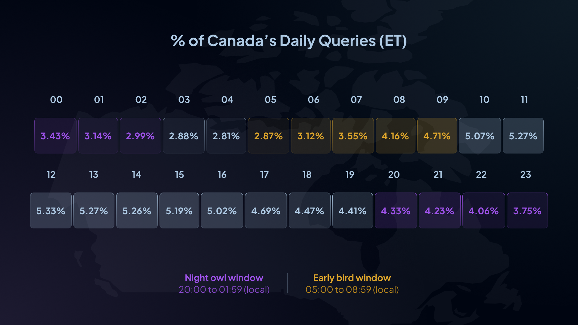 - Canada (approx UTC-5 representative): 22.9% of daily queries land in the night-owl window; 13.7% land in the early-bird window.