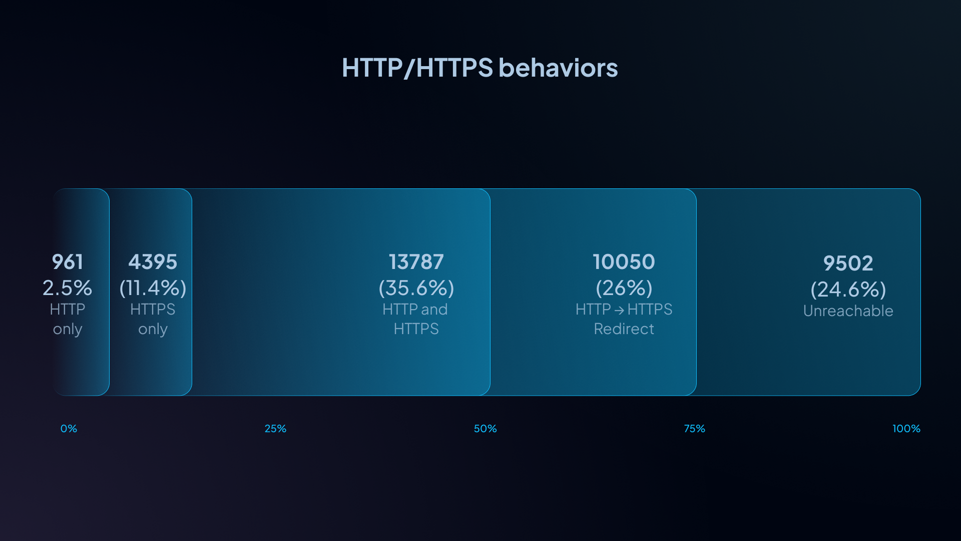 What does this mean for browsing? HTTPS is clearly the default posture for popular domains (either enforced or preferred about half the time when reachable), and truly HTTP-only sites are now a small minority. The big “gotcha” in practice is less “the web is stuck on HTTP” and more “a non-trivial chunk of domains just don’t reliably answer this kind of probing at all” (the 24.6% unreachable bucket).