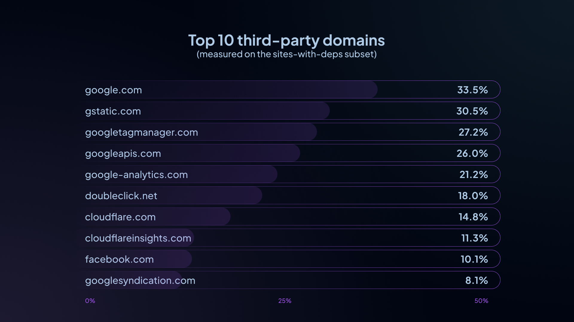 Among sites with third-party dependencies, the most common third-party domains are heavily concentrated in a few major ecosystems (percentages below are “% of sites-with-deps that include this third-party domain”):
