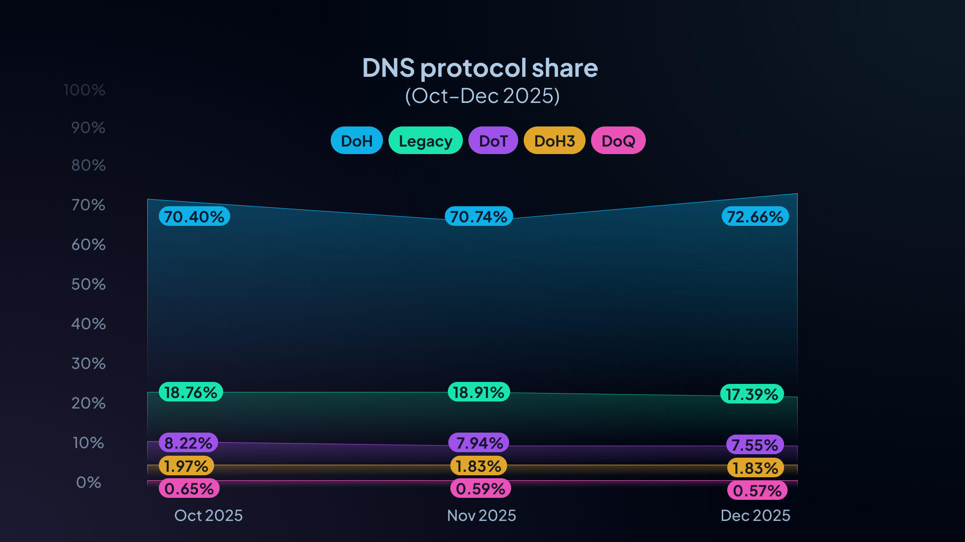 - Encrypted DNS (DoH/DoH3/DoT/DoQ) made up 81–83% of traffic overall: